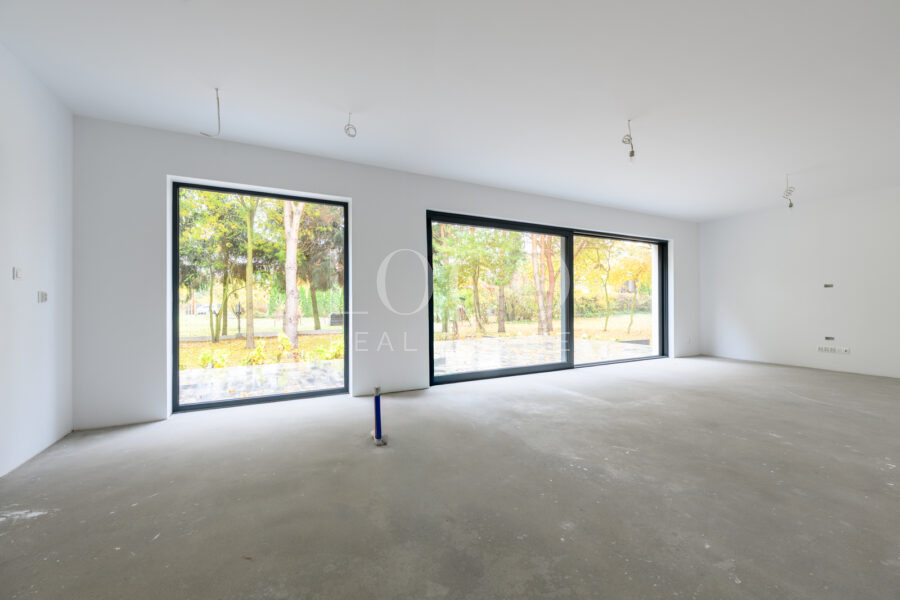 Salon jest przestronny i jasny z panoramicznymi oknami i bezpośrednim wyjściem na taras.