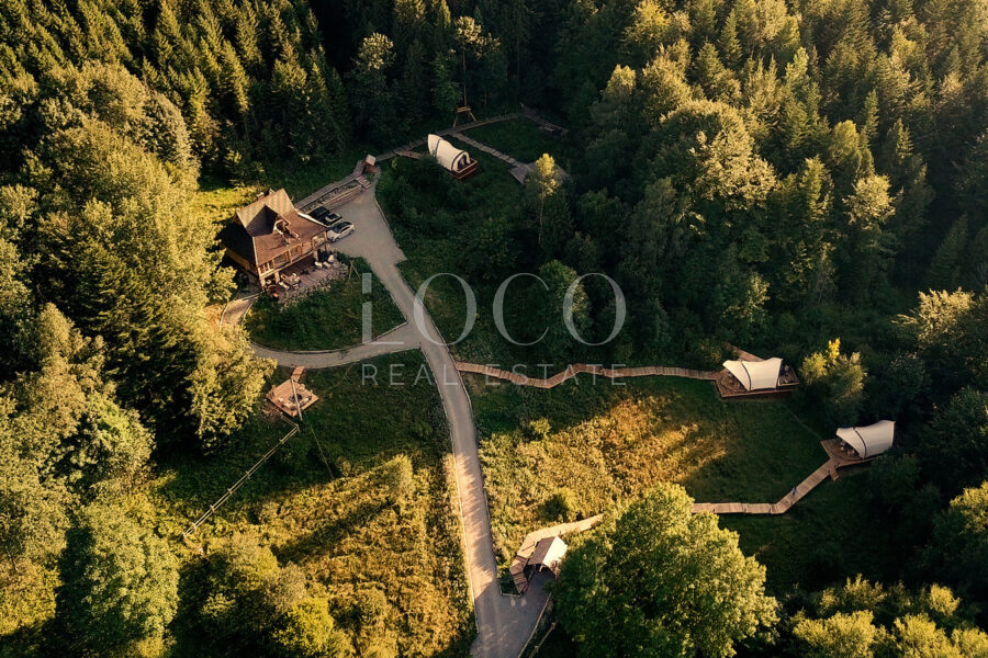 Nieruchomość została stworzona w przemyślany, bardzo spójny sposób z poszanowaniem natury. Istotnym elementem tej koncepcji są również 3 ekskluzywne suity czyli wysokiej jakości jurty połączone z drewnianym wykończeniem – całość wykonana w modnym stylu glamping. Każda suita ma powierzchnię ok. 35 m2 i jest połączona z drewnianymi tarasami, z każdego tarasu schody prowadzą prosto do zanurzonych w lesie, położonych przy górskim potoku dwuosobowych wanien opalanych drewnem co pozwala na absolutne oddanie się leczniczej sile przyrody. Jeden z trzech suitów został dodatkowo ocieplony, dzięki czemu zyskał charakter całoroczny.